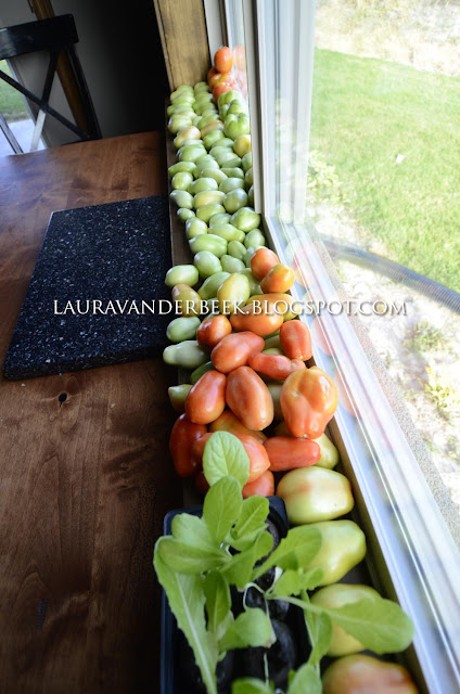 I did have a crazy run in with the tomato hornworm. I found a one inch tiny one first - not bad. Then as I was shaking the only roma tomato in a cage this big fat hornworm flopped on the ground. It was at least 3/4 inch wide and 5 inches long. Gag! I screamed and then jumped back a few feet. I lost half my roma tomatoes which is sad because I really wanted to try making my own tomato sauce because I purchased one of these this year. I don't know if the plants will recover enough to give me some more. I ripped off all the larger roma tomatoes - green or otherwise and checked for holes and if they were good, they got washed in soapy water and placed in the window as you can see here. I have 8 roma plants and I don't think I'm going to get much after all.