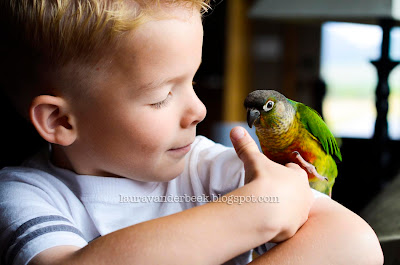 I love this first photo because it is a great image of Kiwi, our yellow sided green cheek conure. It just reminds me how fast my children are growing up. He just looks so grown up here. And confident. Kiwi bit his ear when we first brought him home and it took a little while for him to warm back up to Kiwi.